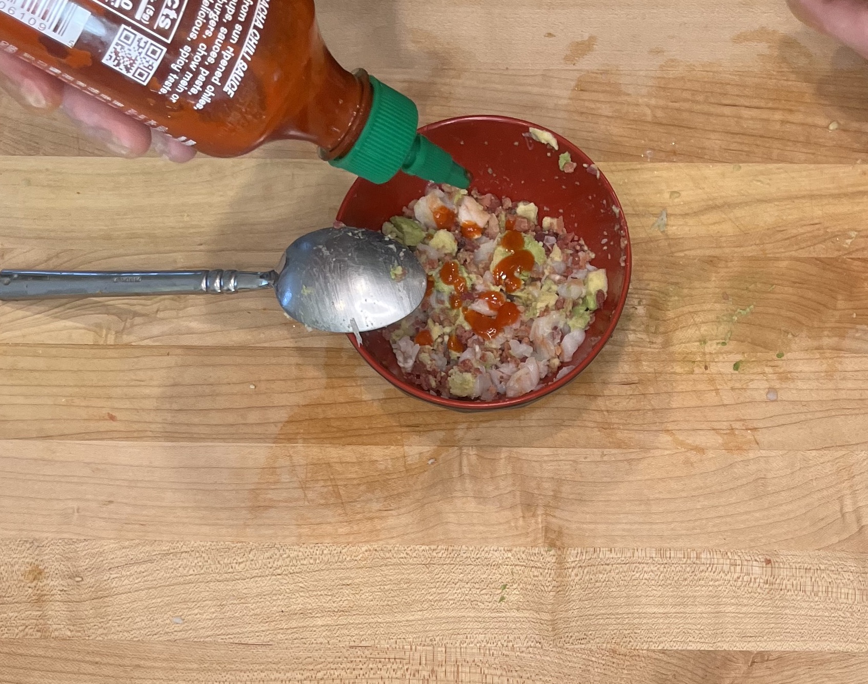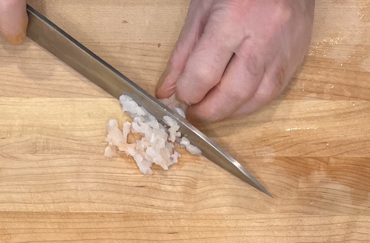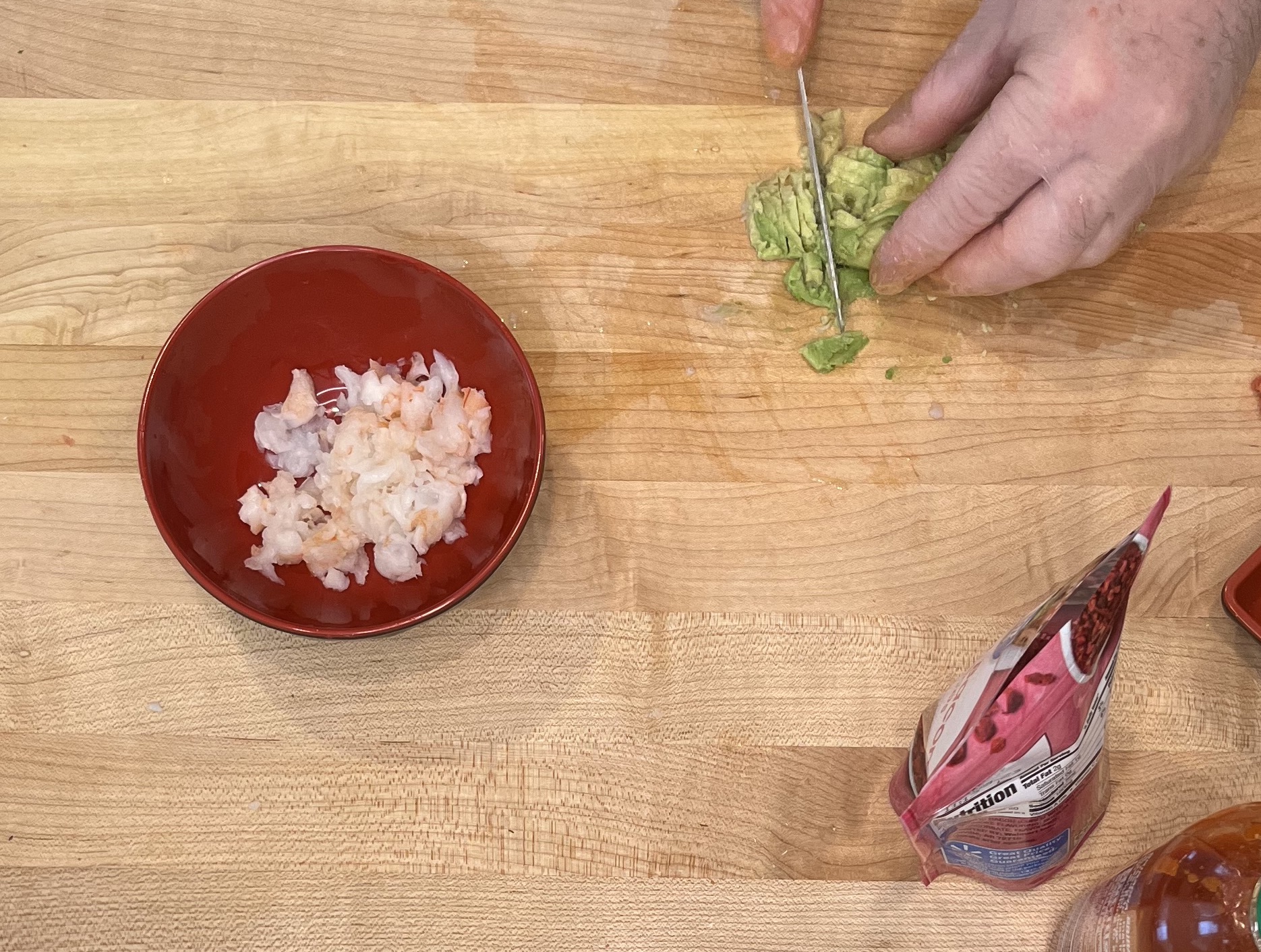 Begin by chopping up large shrimp. The larger the shrimp the better the flavor. It is nearly impossible to have great tasting sushi when using small shrimp.