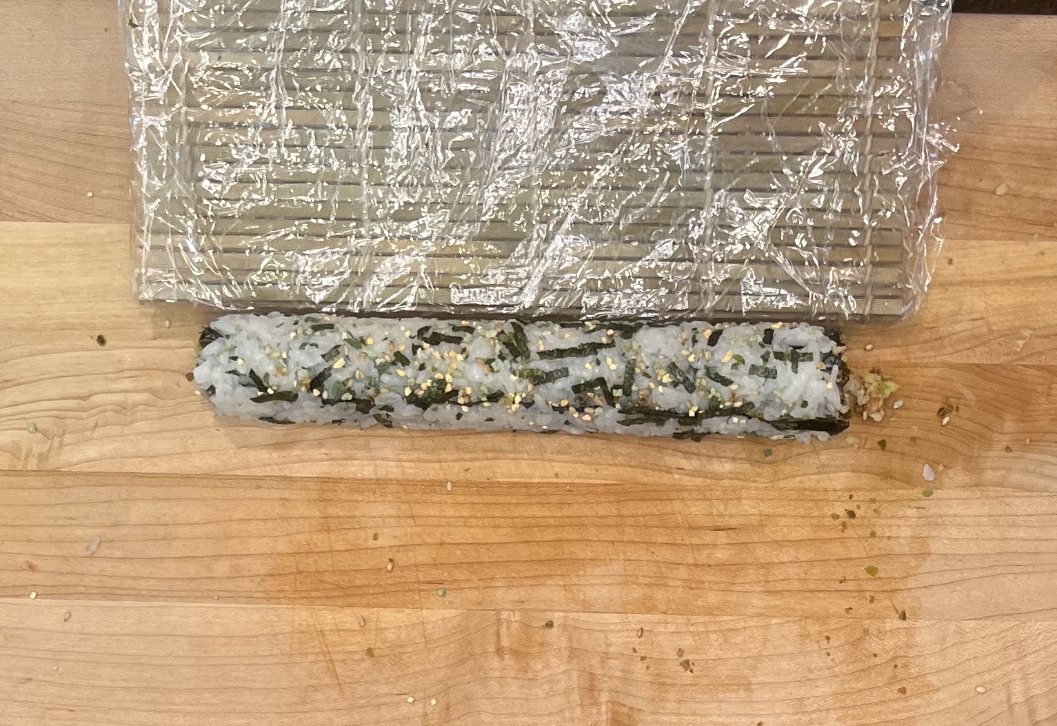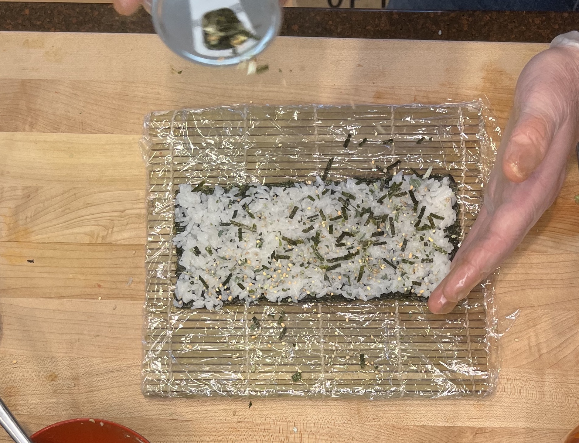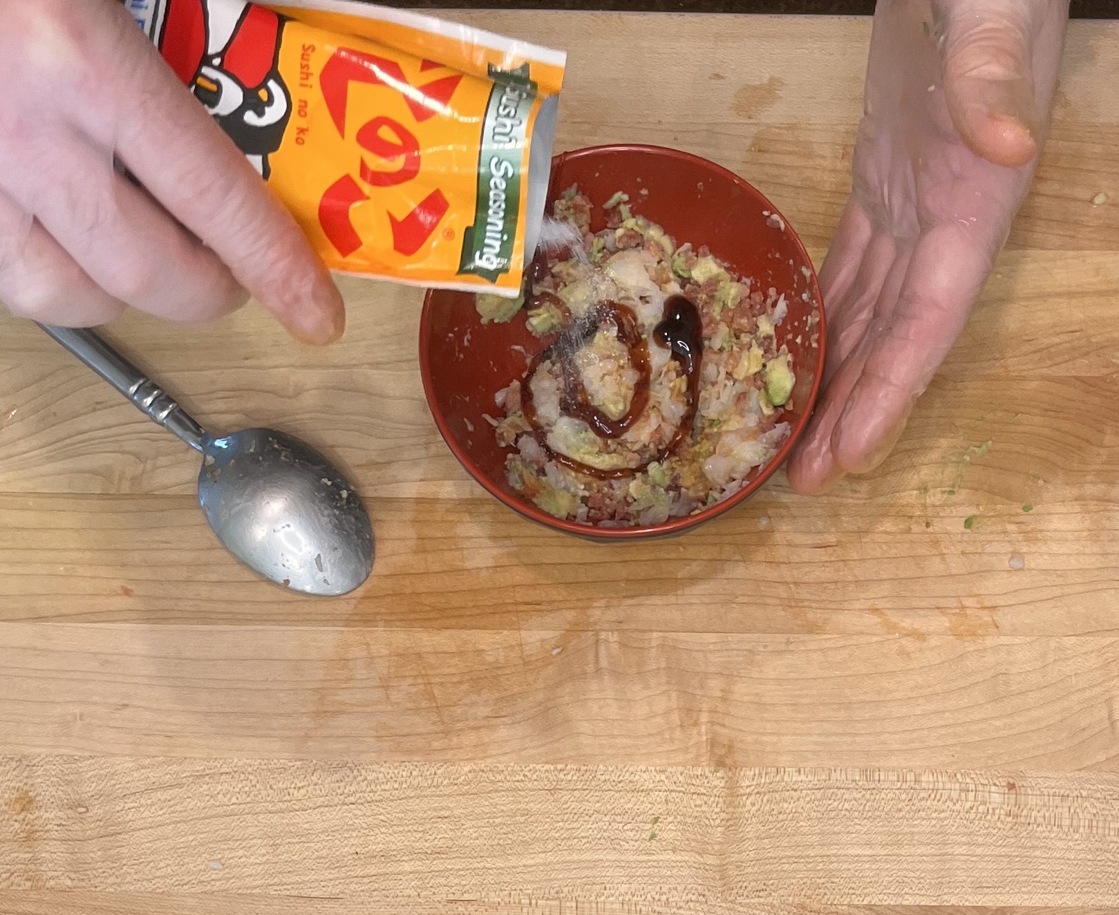Add sushinoko seasoning to this roll for robust flavor. Be generous when adding the sushinoko seasoning.