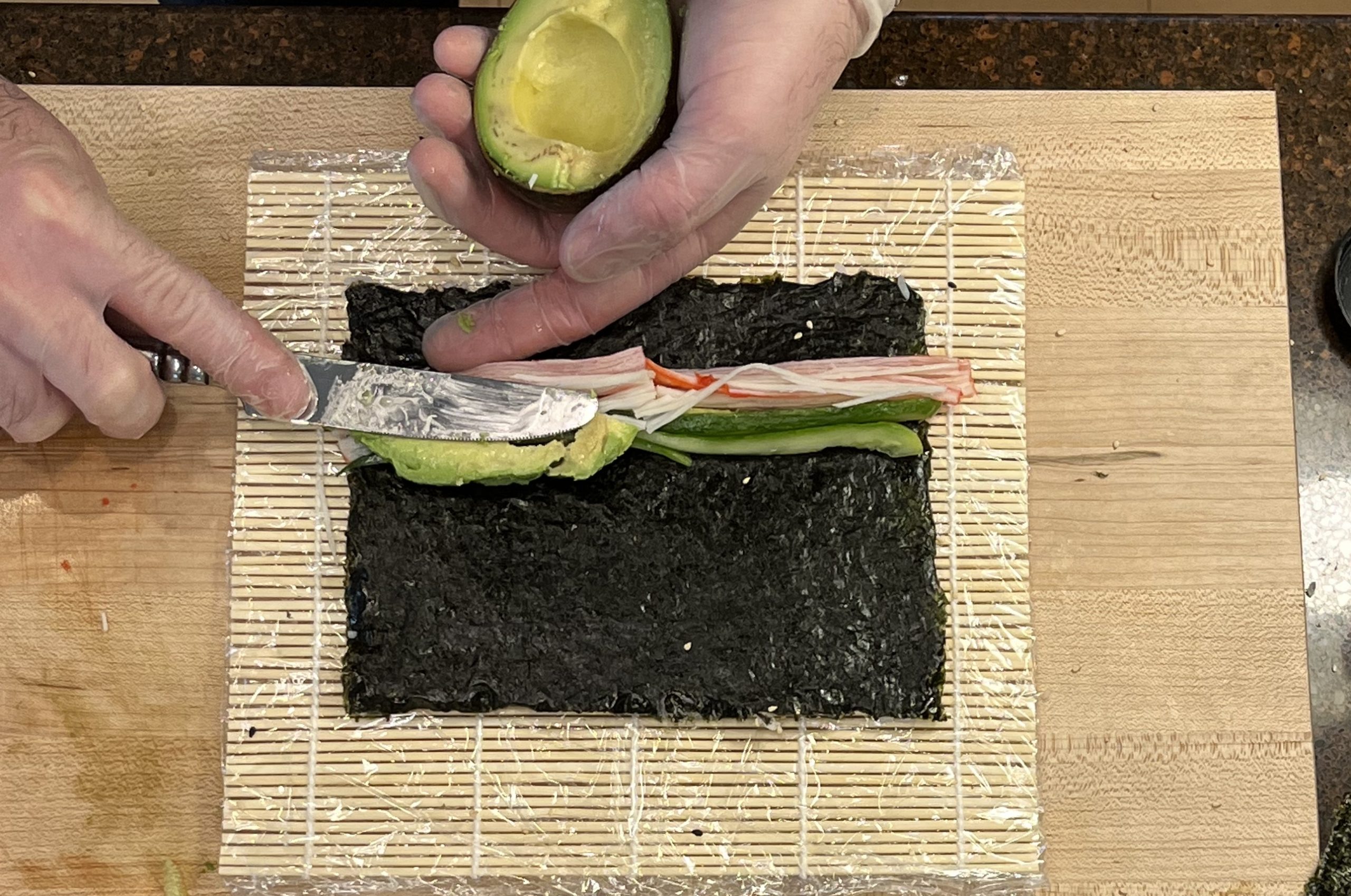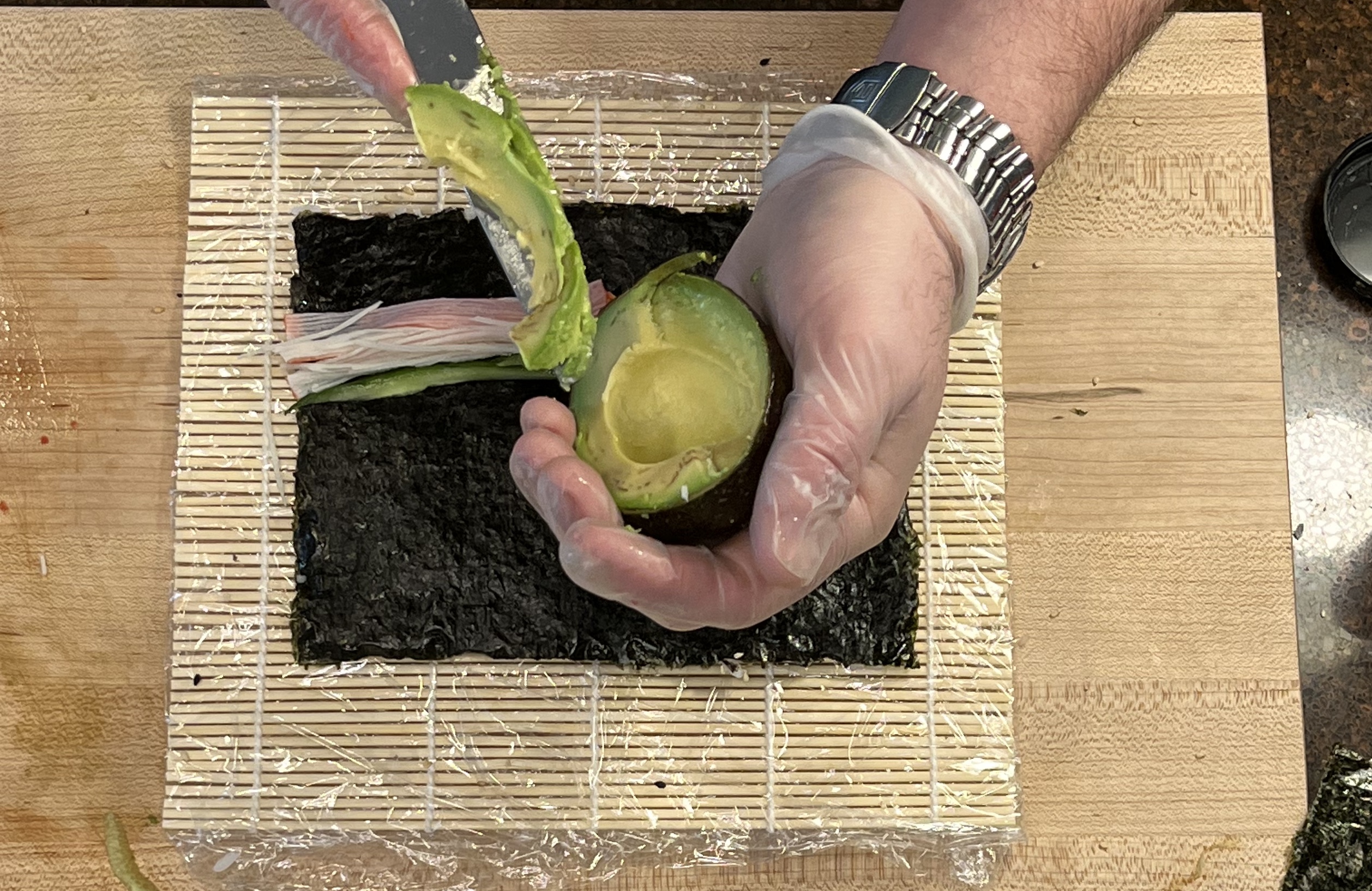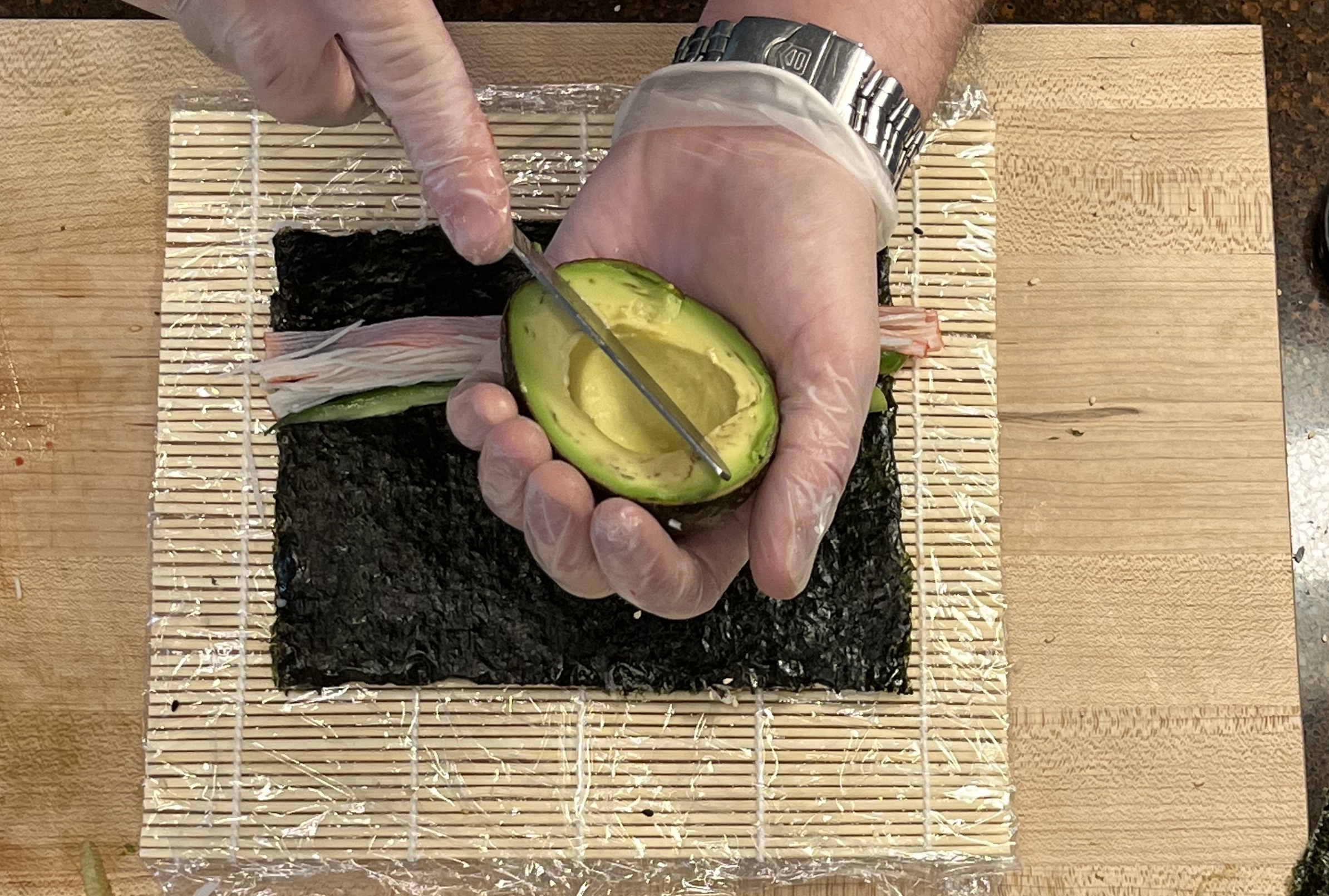 Add Imitation crab (sliced in half the long way). Too much crab takes away from the avocado flavor in the finished product.