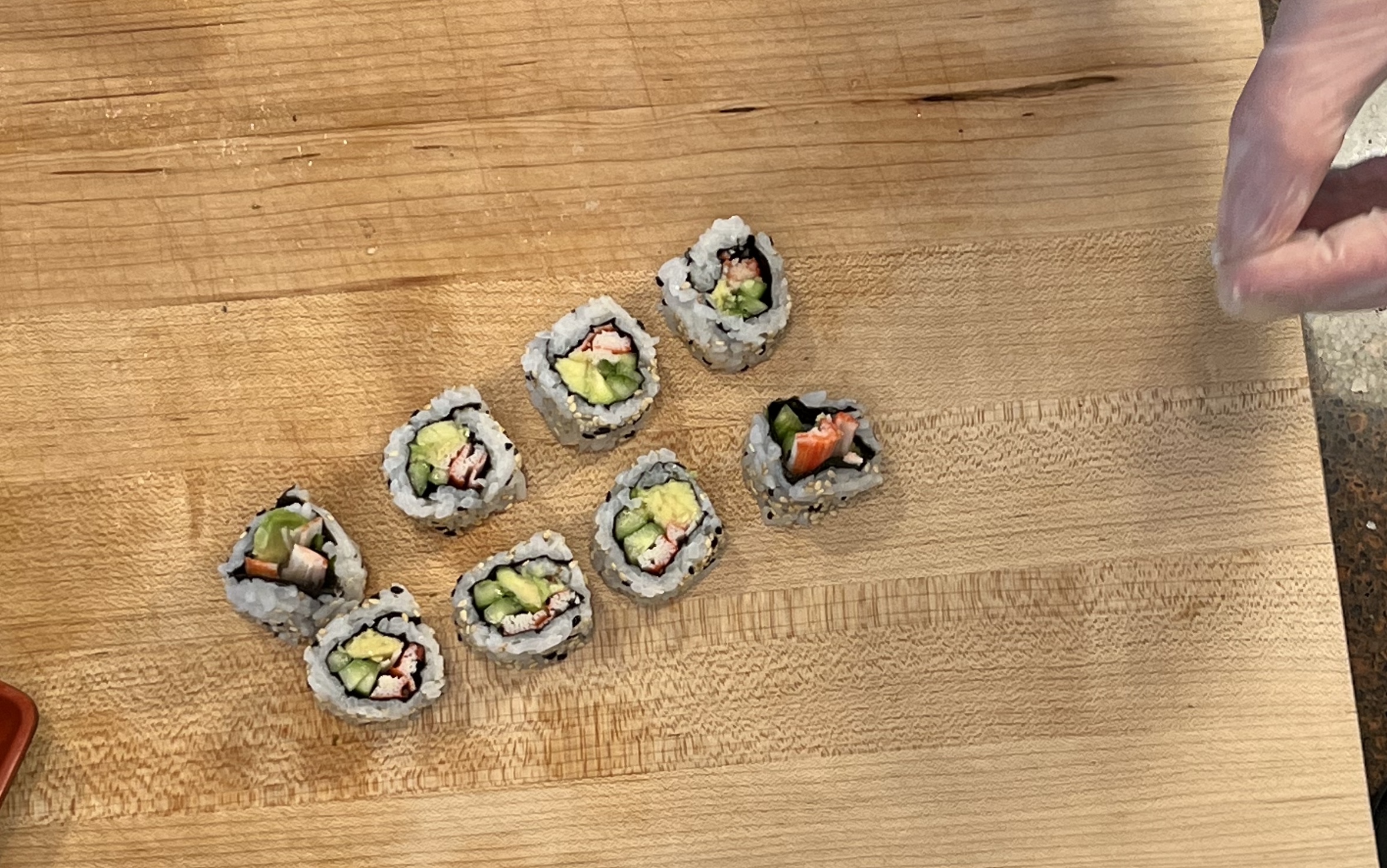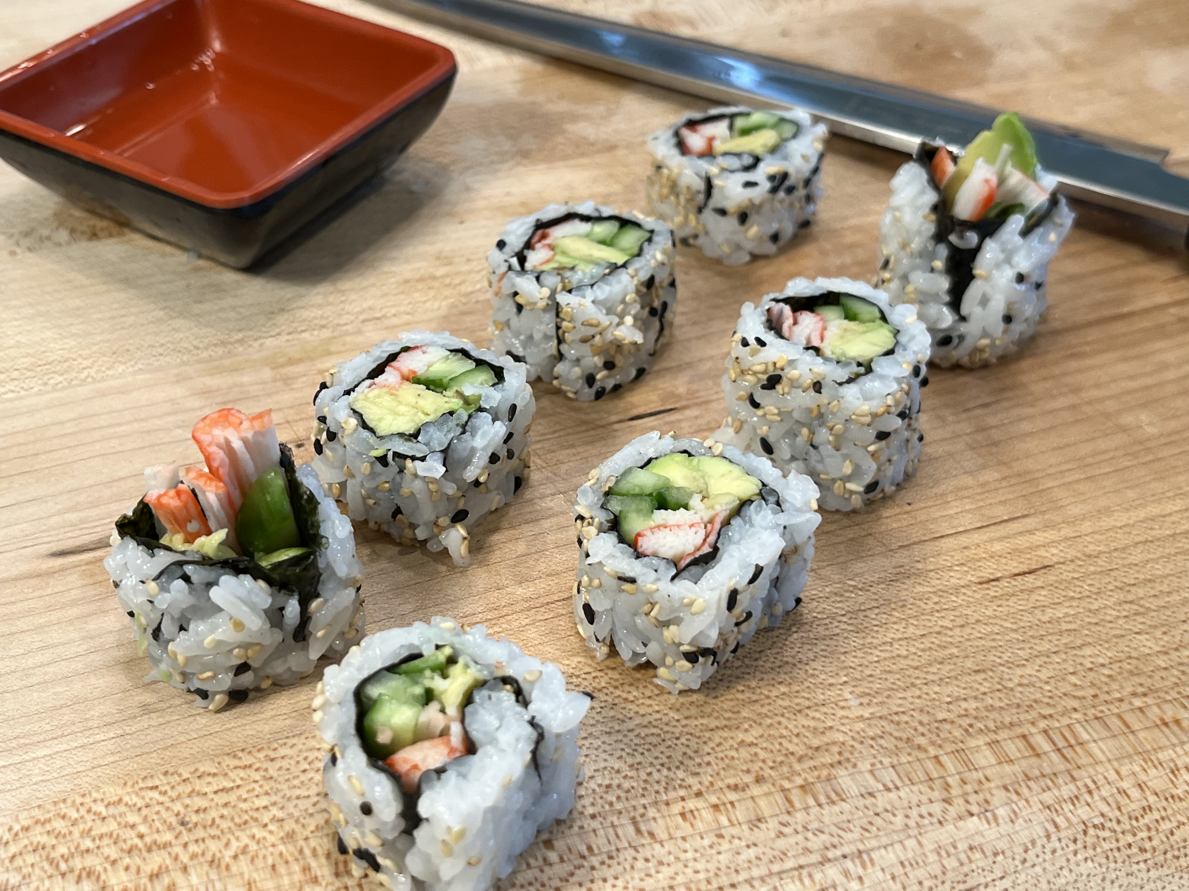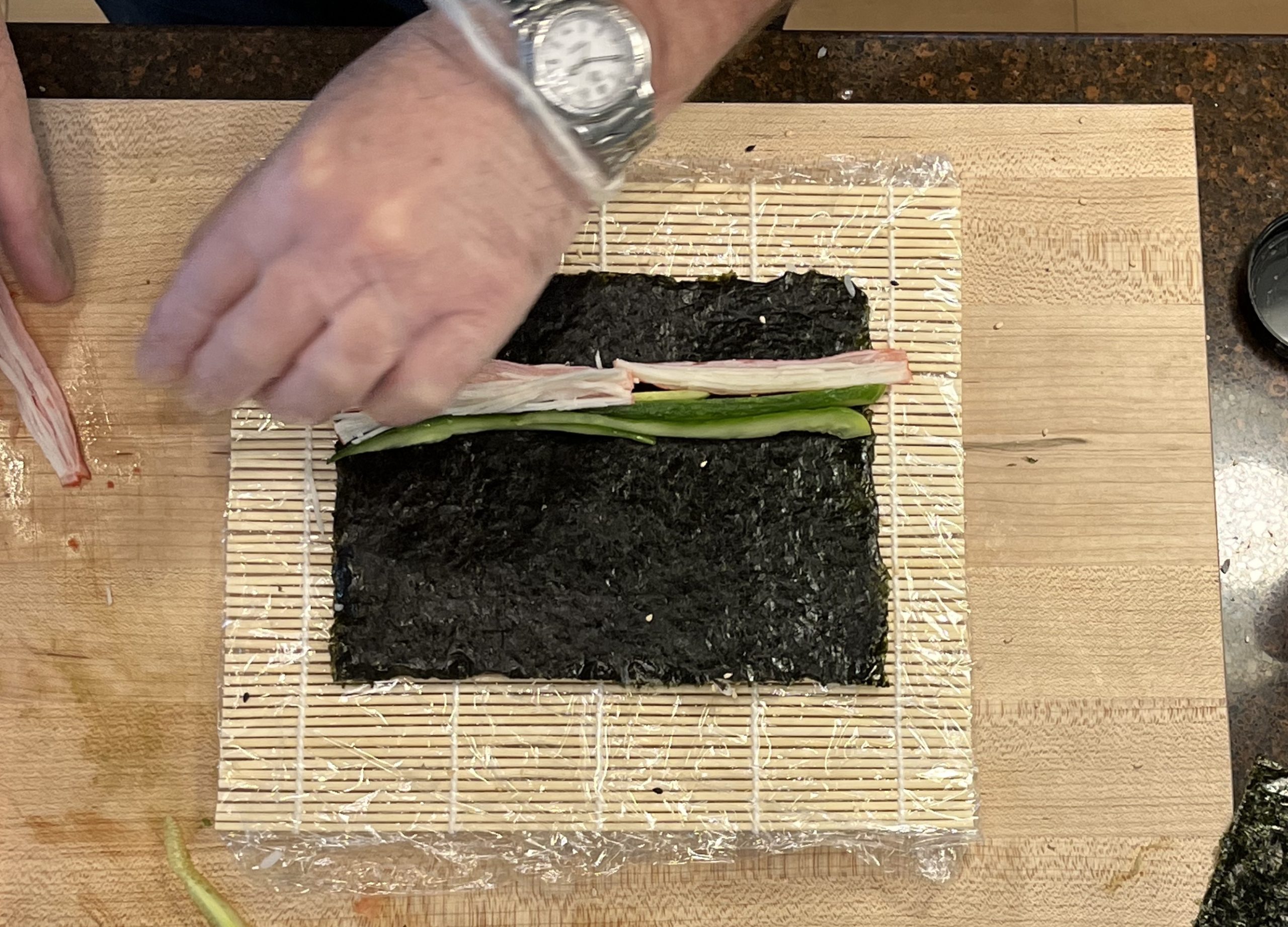 Add Imitation crab (sliced in half the long way). Too much crab takes away from the avocado flavor in the finished product.
