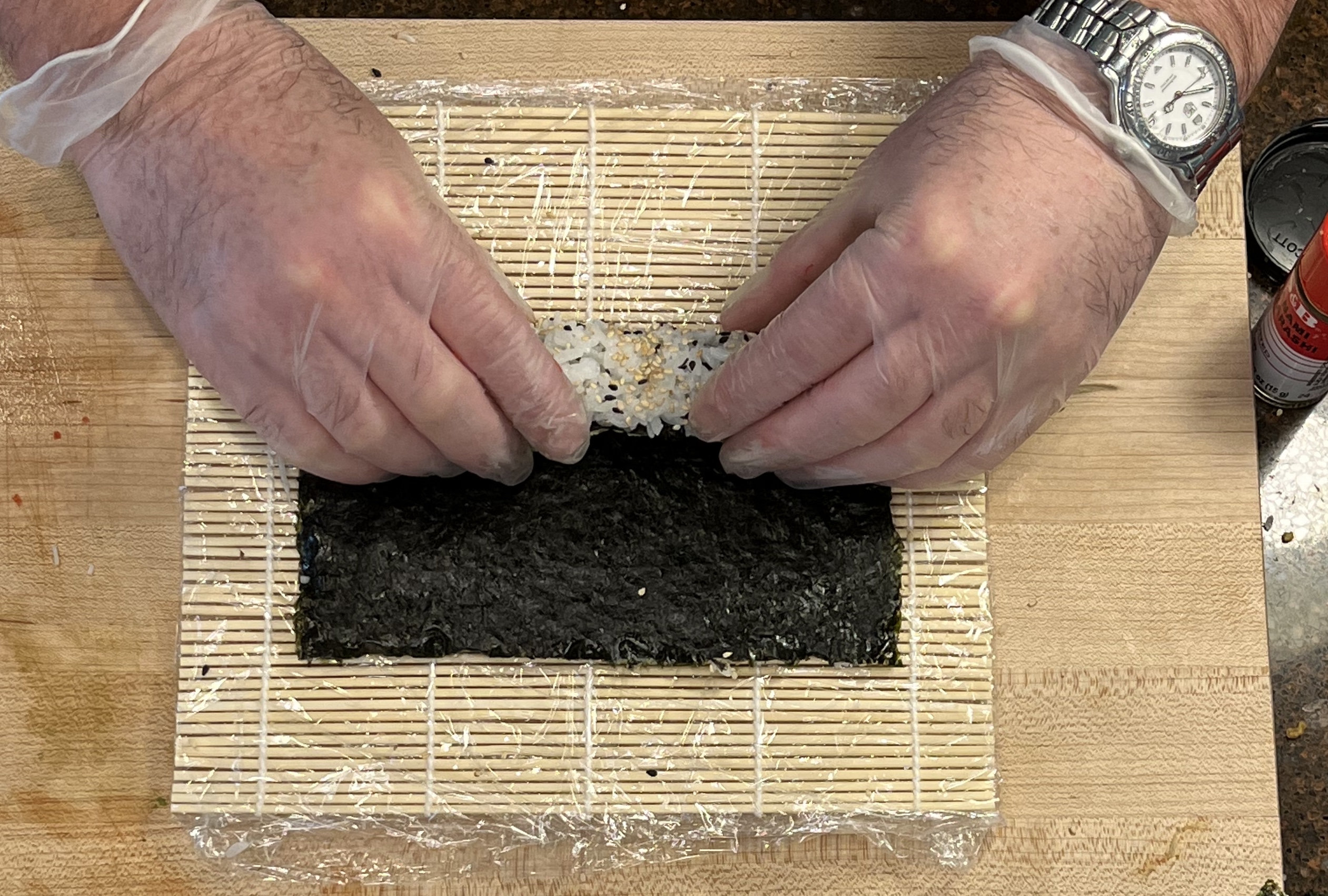 Lift the edge of the bamboo to bring the nori up to where you can push it over the ingredients.