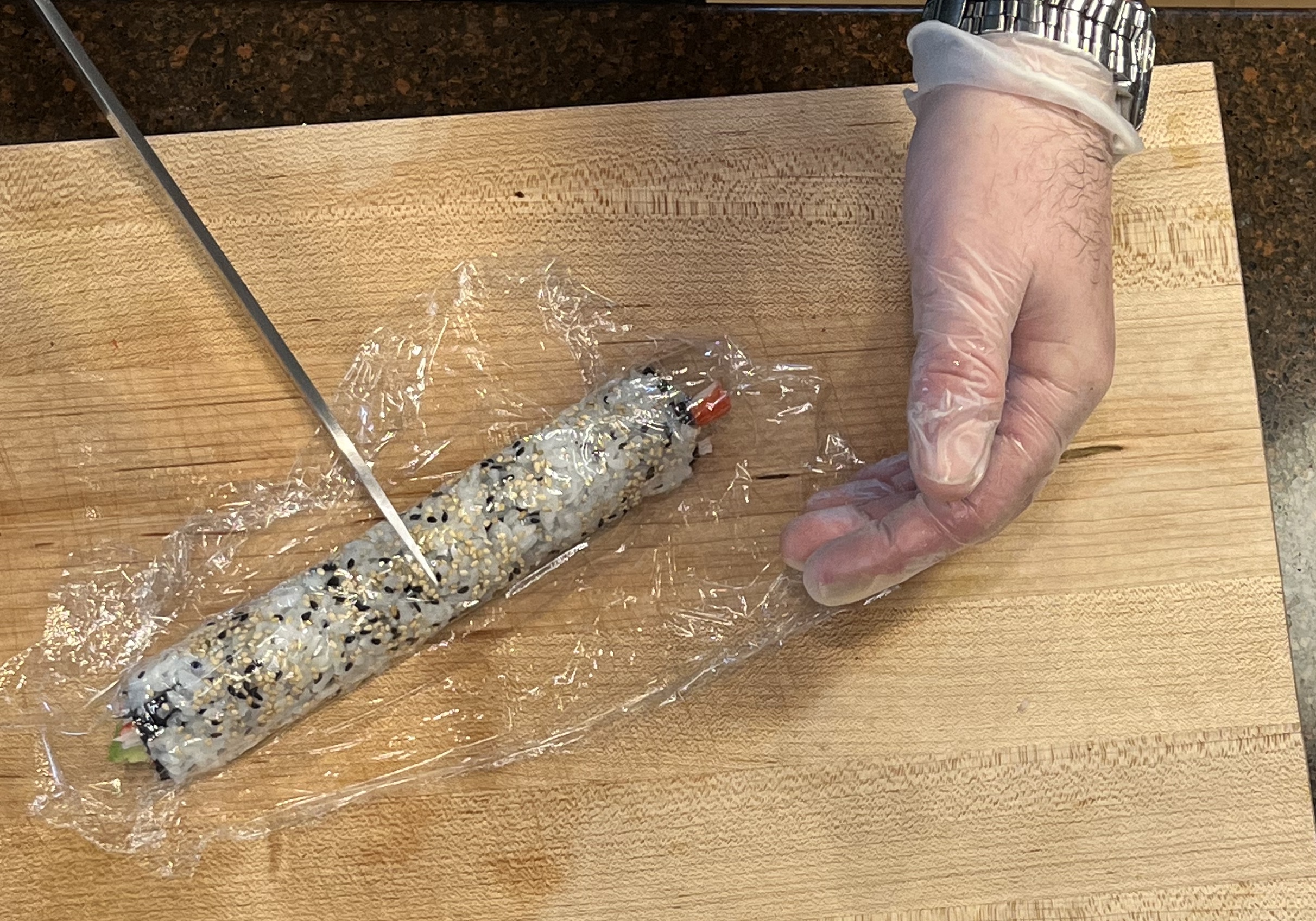 Slowly slice the roll (let the knife do the work). You shouldn’t have to press down much, just slowly move it forward and the knife will cut the roll. Use fingers to hold roll in place as cutting.