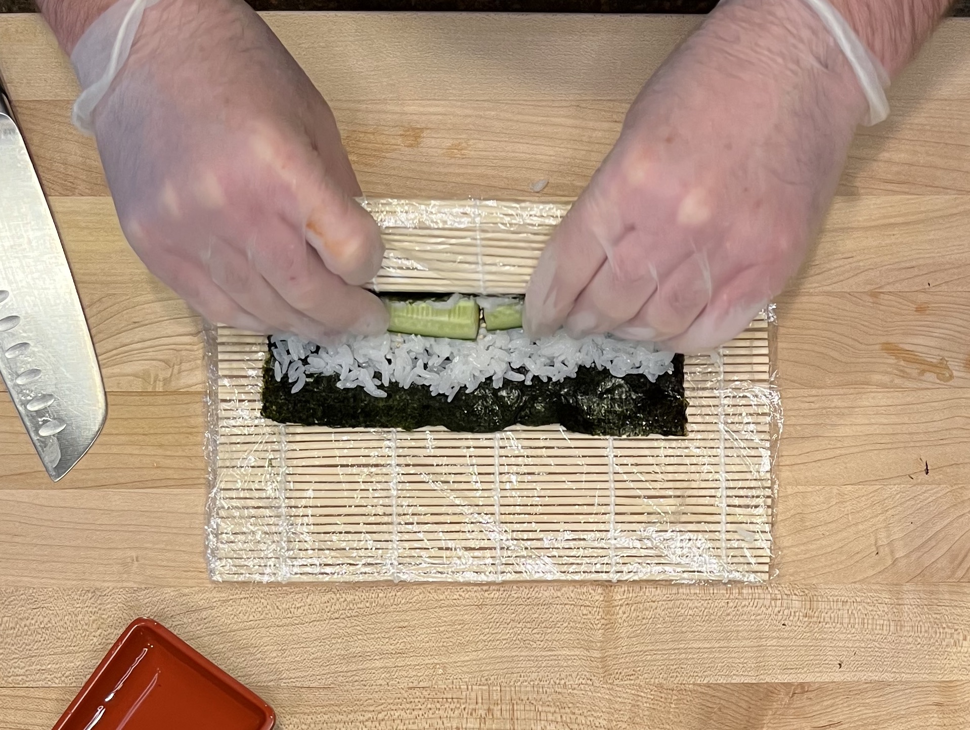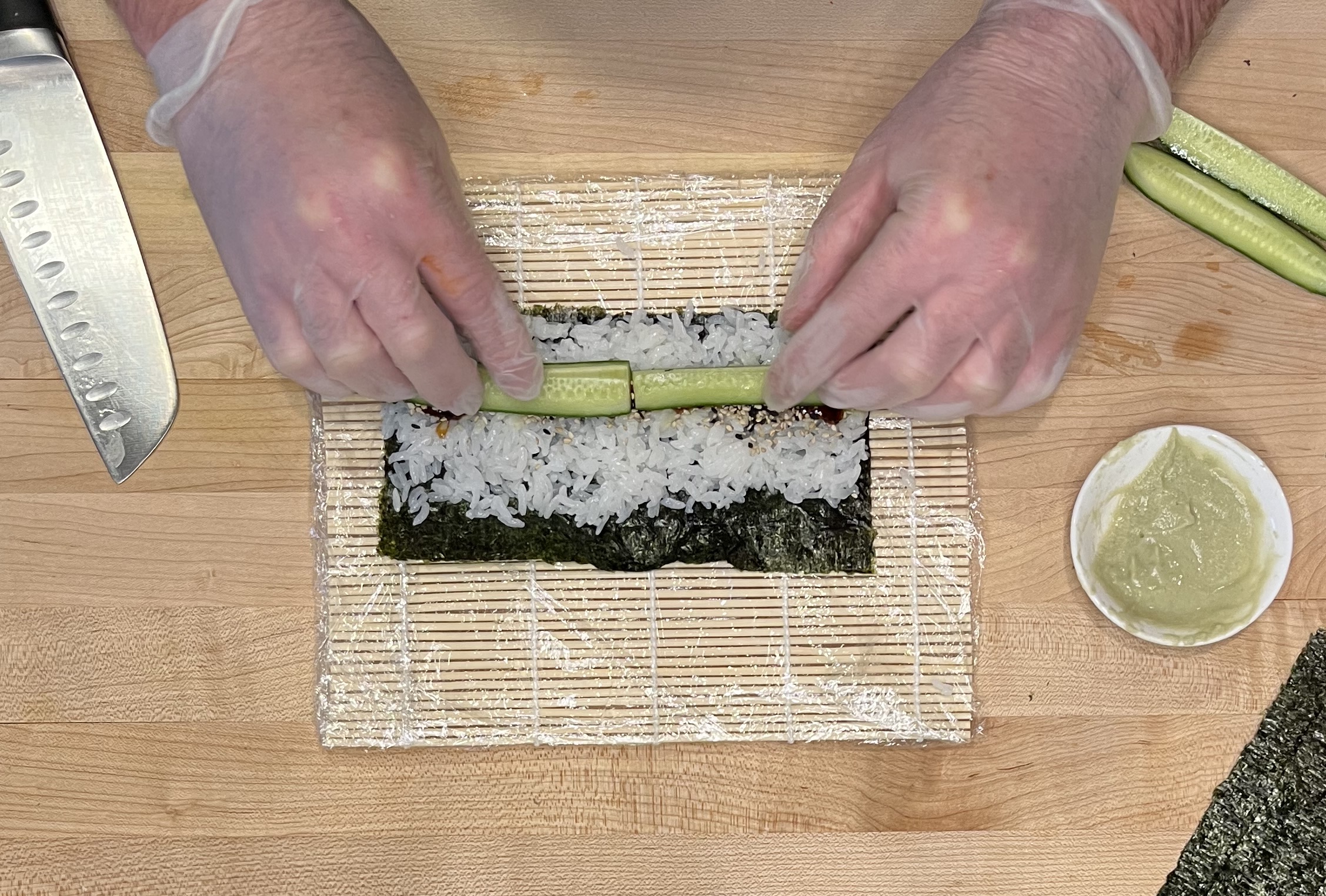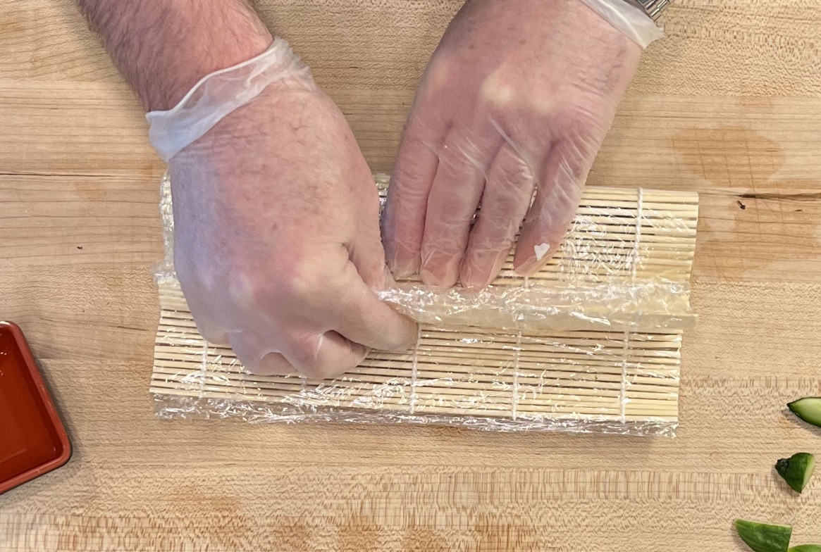 slice a small cucumber into quarters or use long strips from a large cucumber.  Slice the ends of small cucumber so they face each other in the middle of the roll.