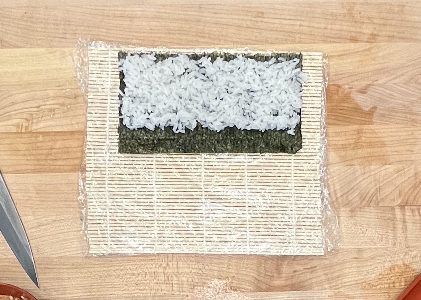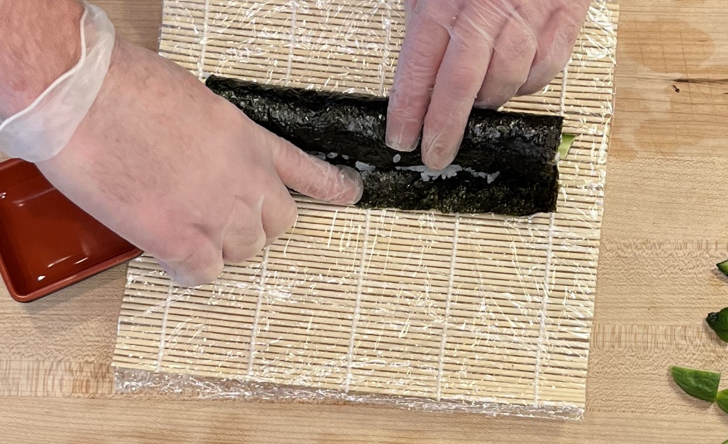 Moisten the edge of the nori so it seals when you roll.