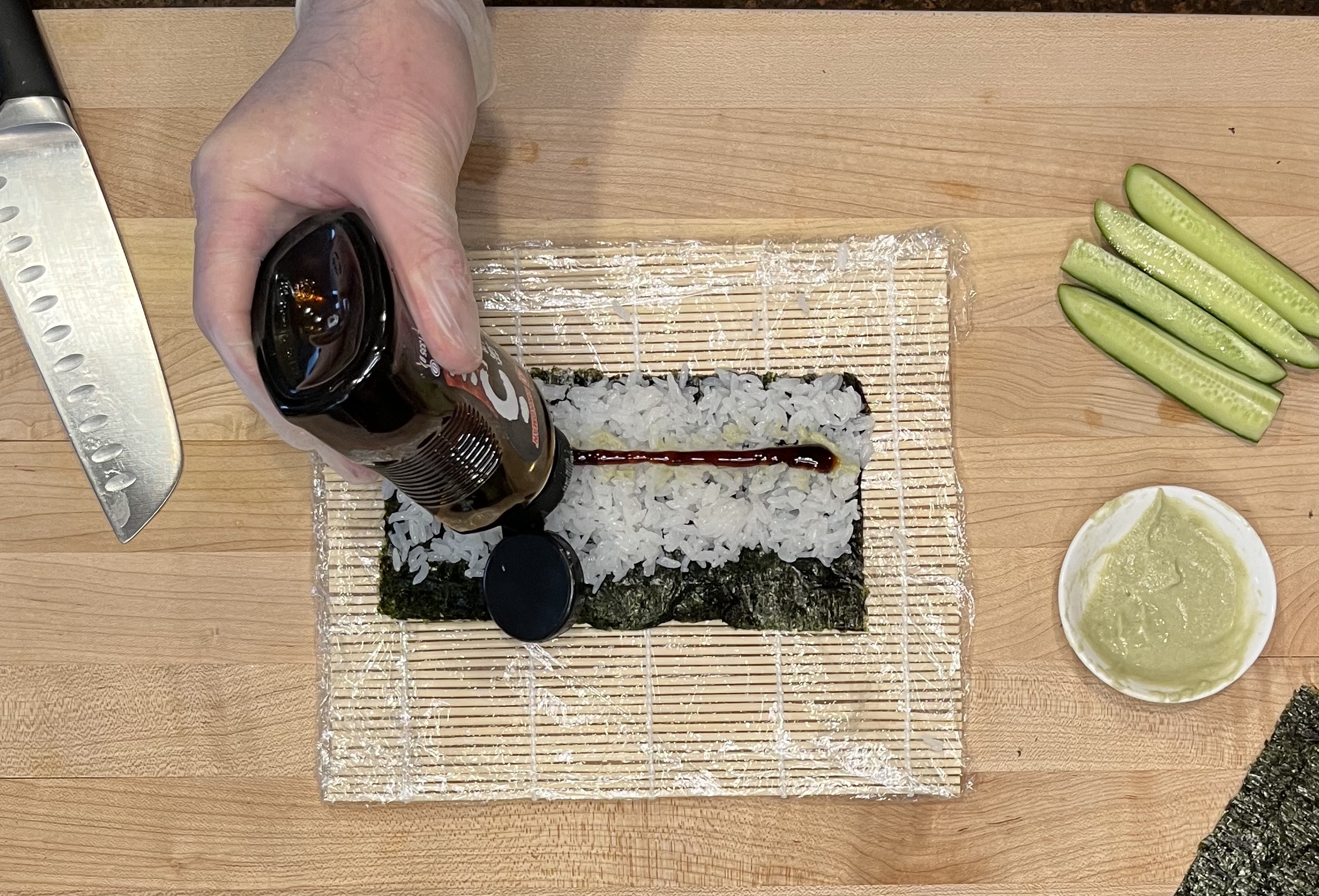 Lay a strip of unagi (eel) sauce to give some sweetness to this roll.
