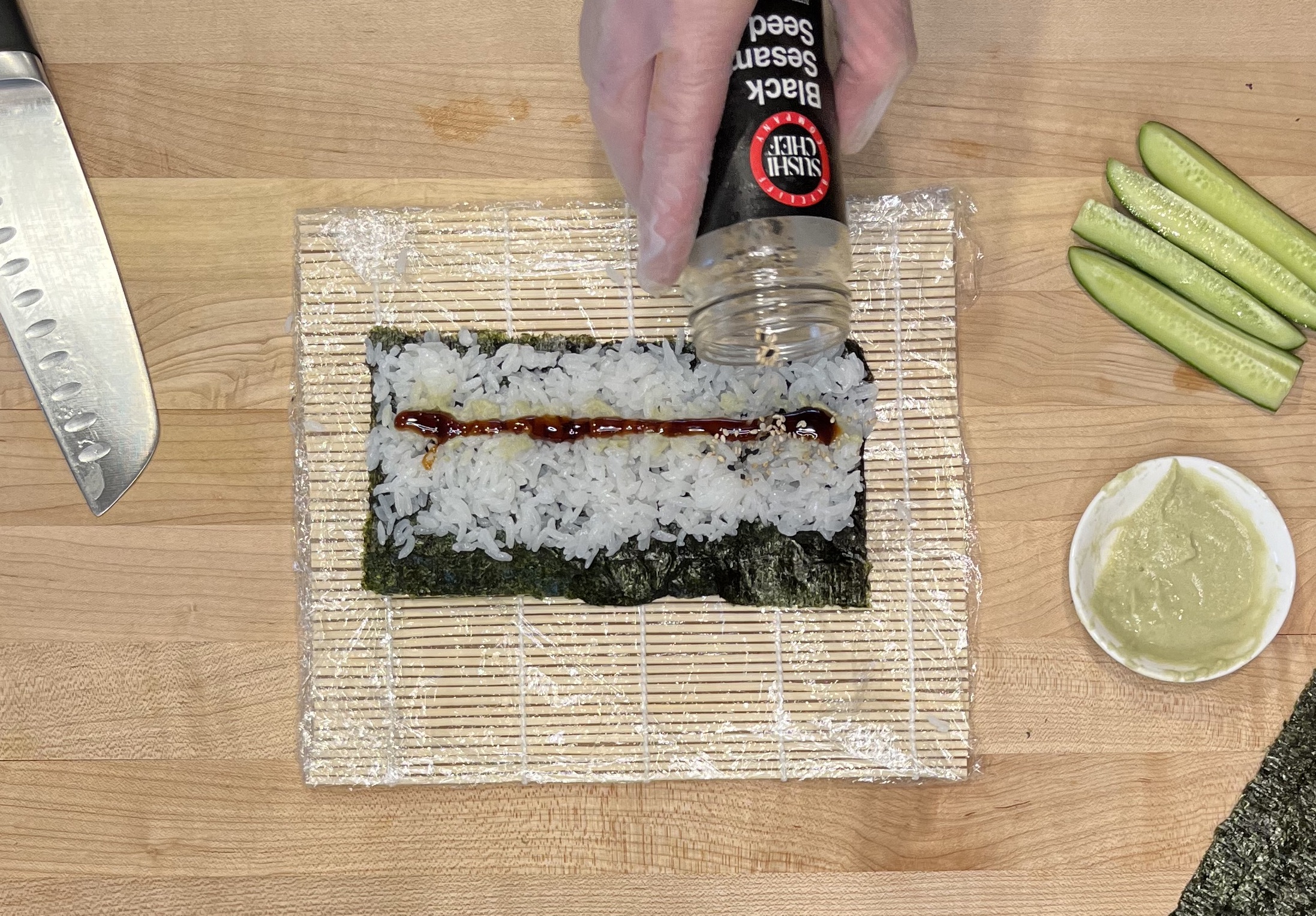 Adding some sesame seeds adds a little crunch and flavor to a cucumber roll.