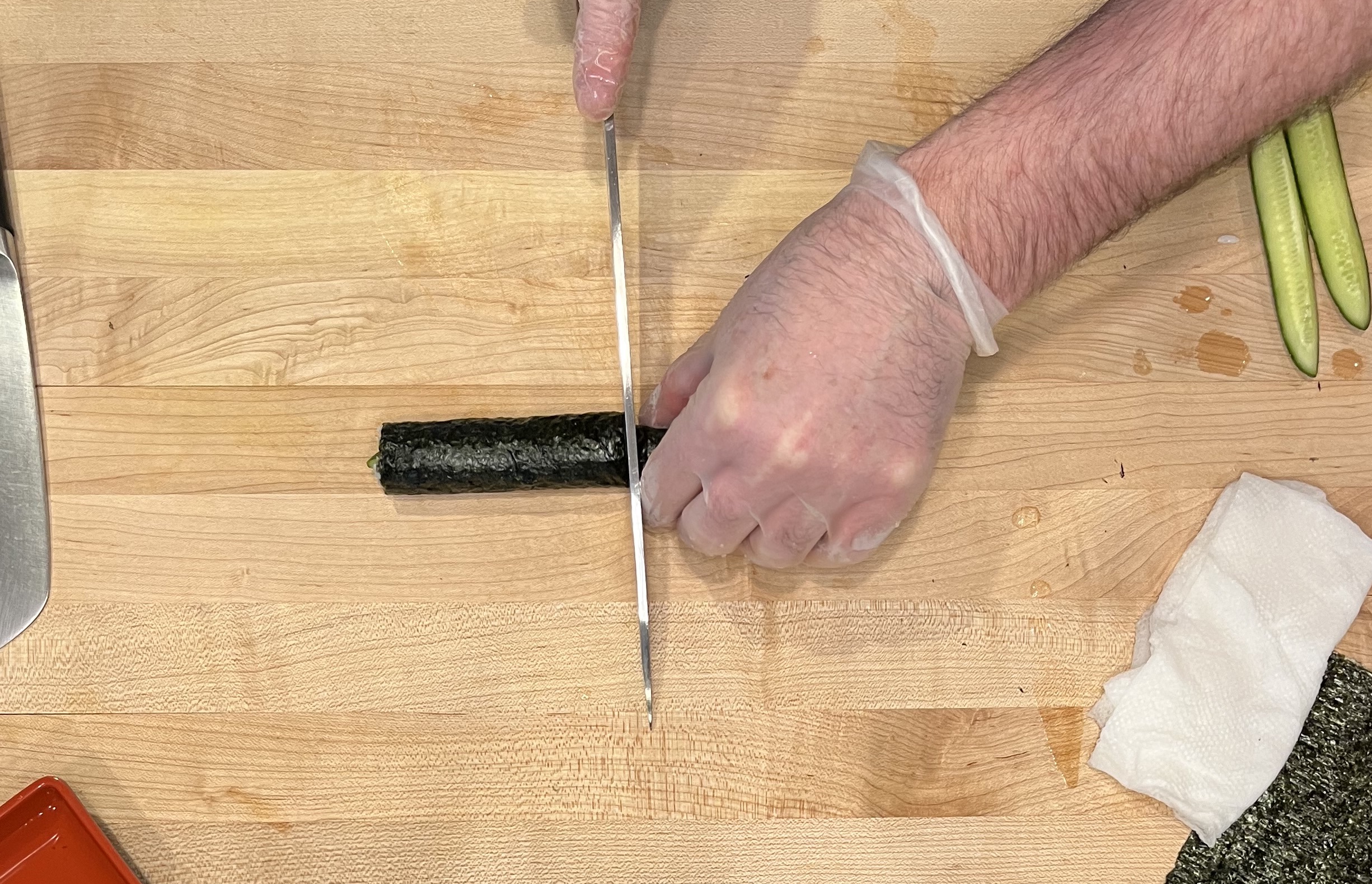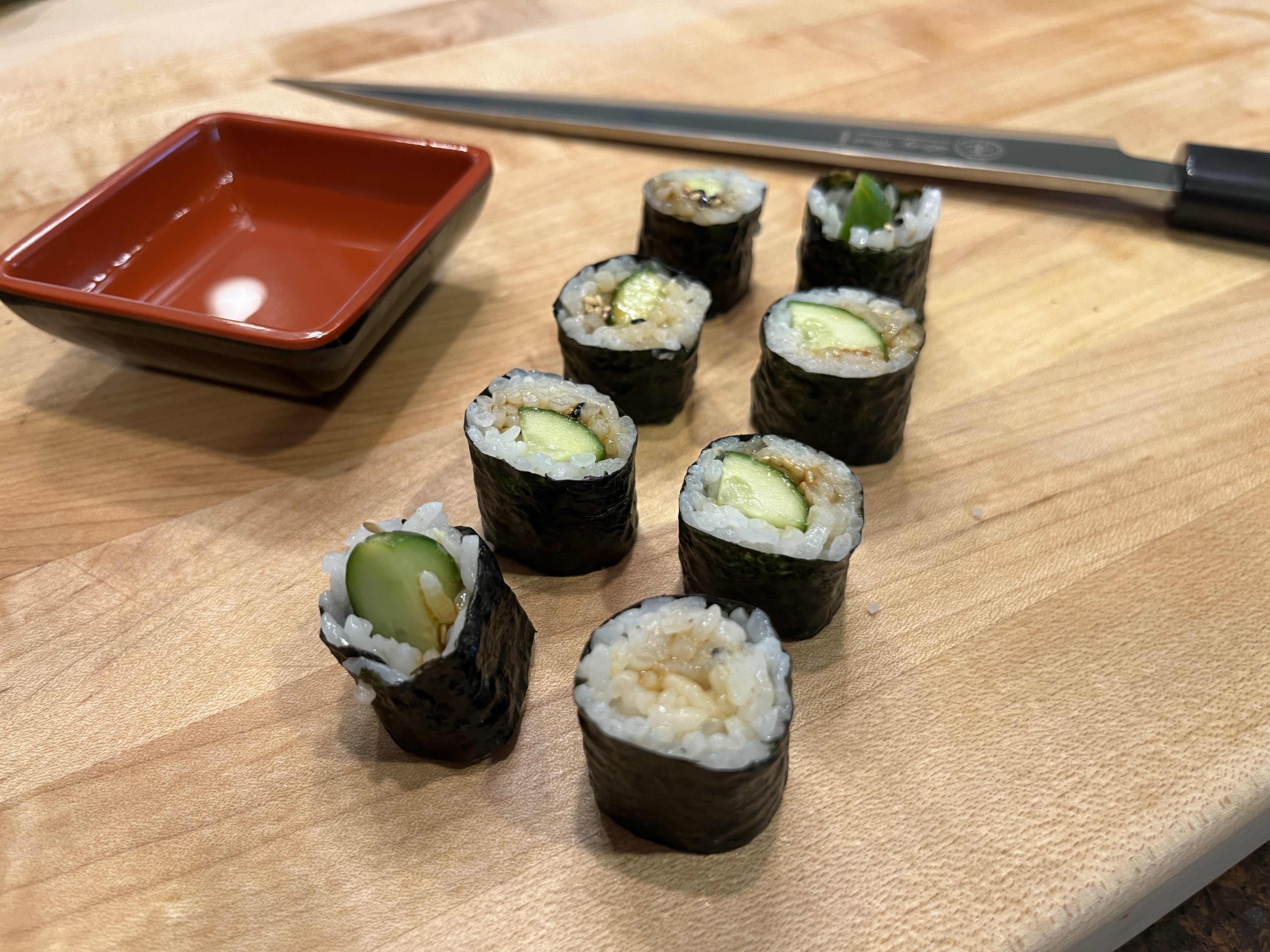 Cucumber rolls are easy to make and a tasty snack.  This is the perfect roll to make while perfecting your sense of touch as you roll and cut maki rolls.