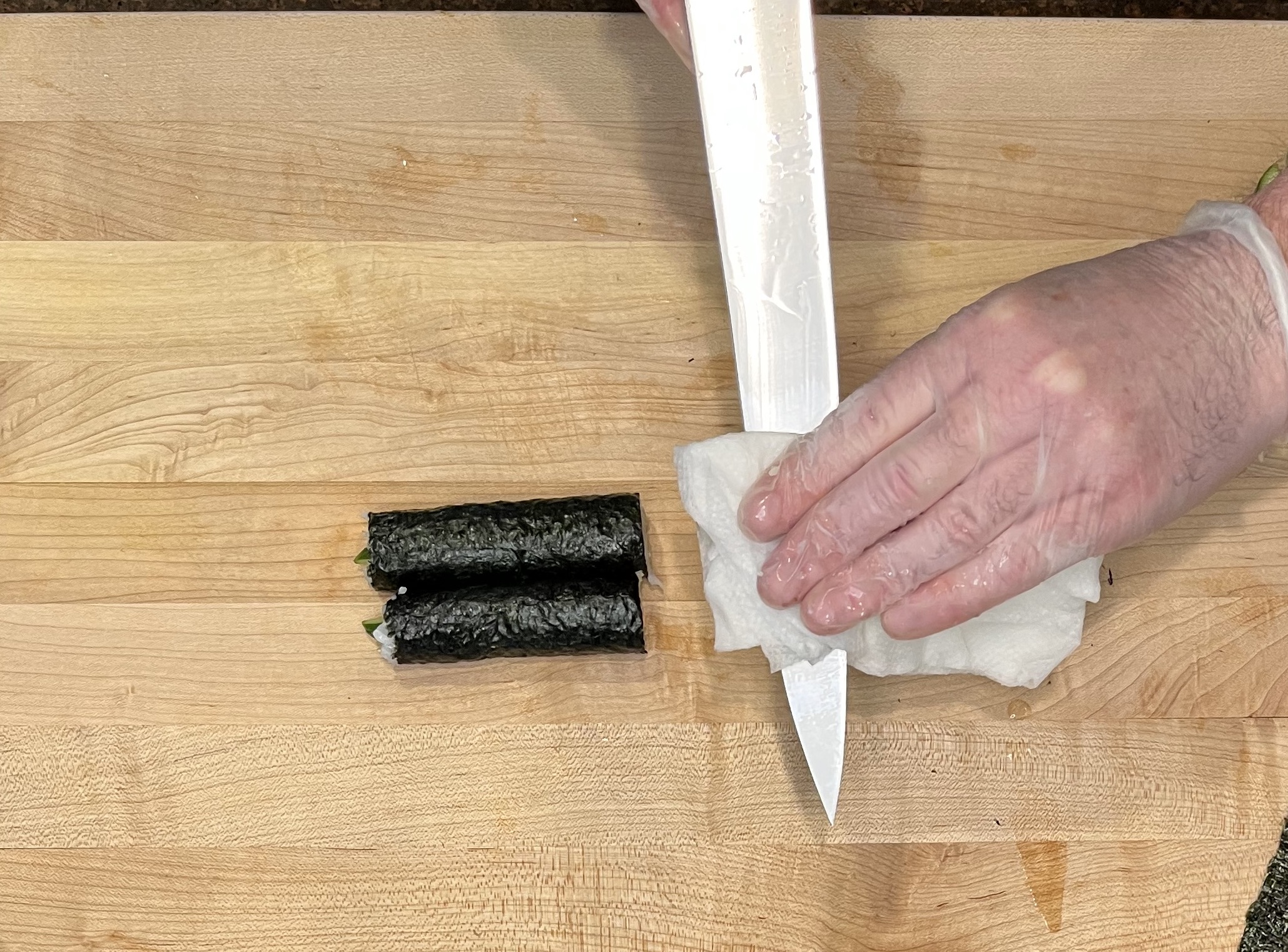 Always wash the starches off the knife after cutting.  Starches from the rice adhere to the blade and adds friction.  Friction results in sloppy cuts.
