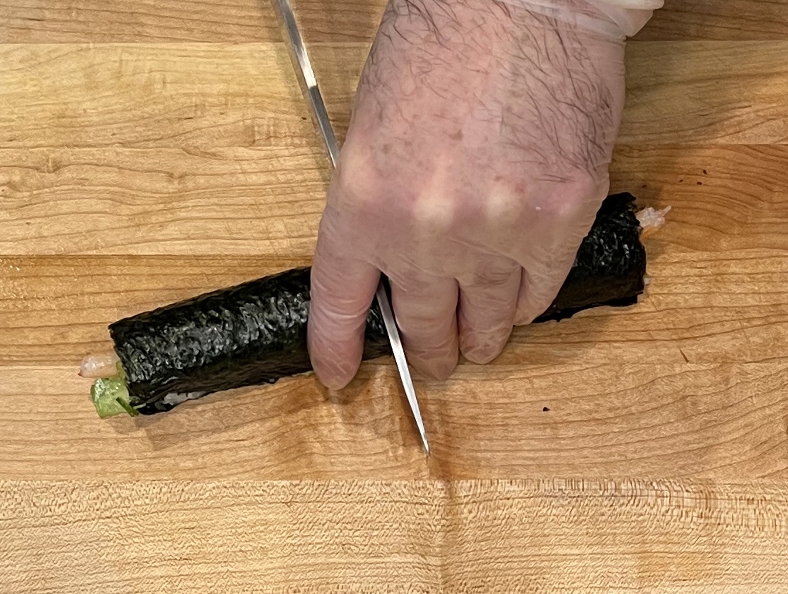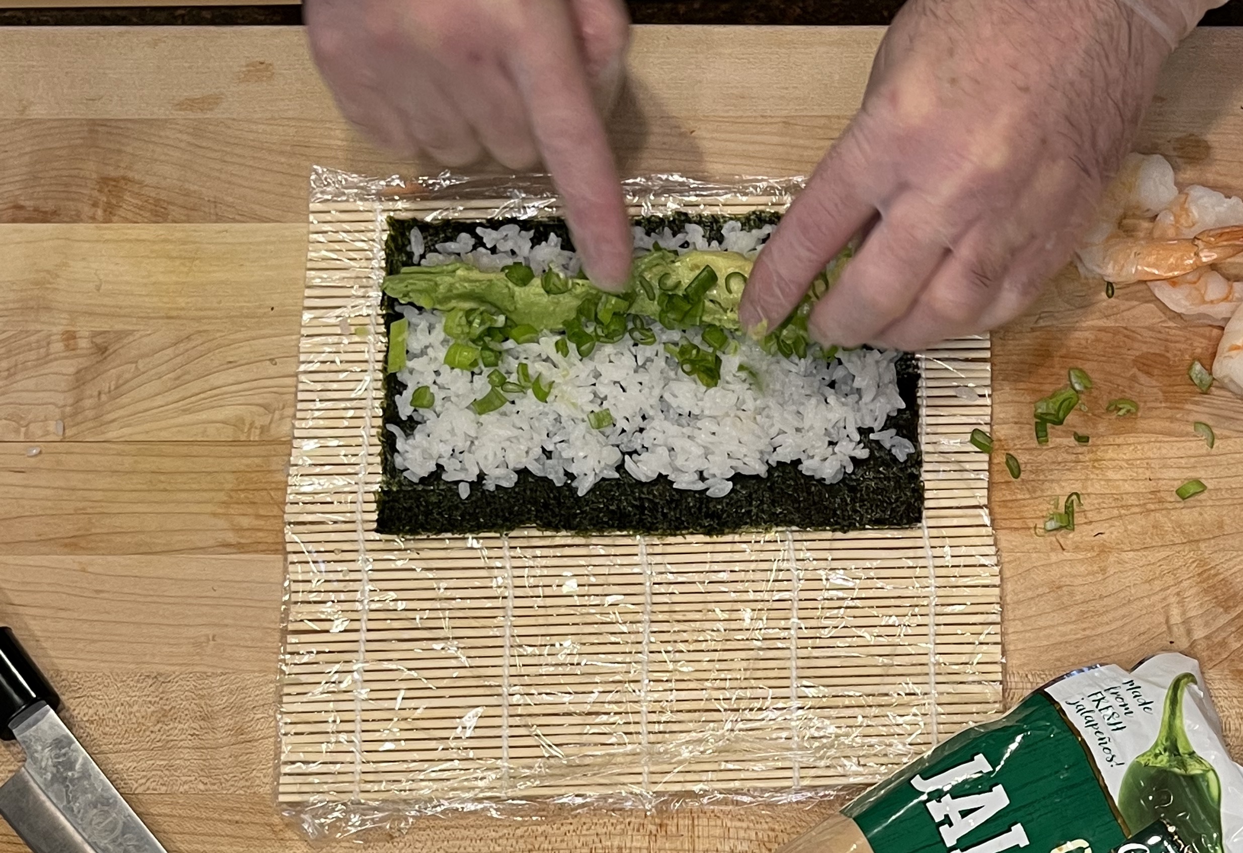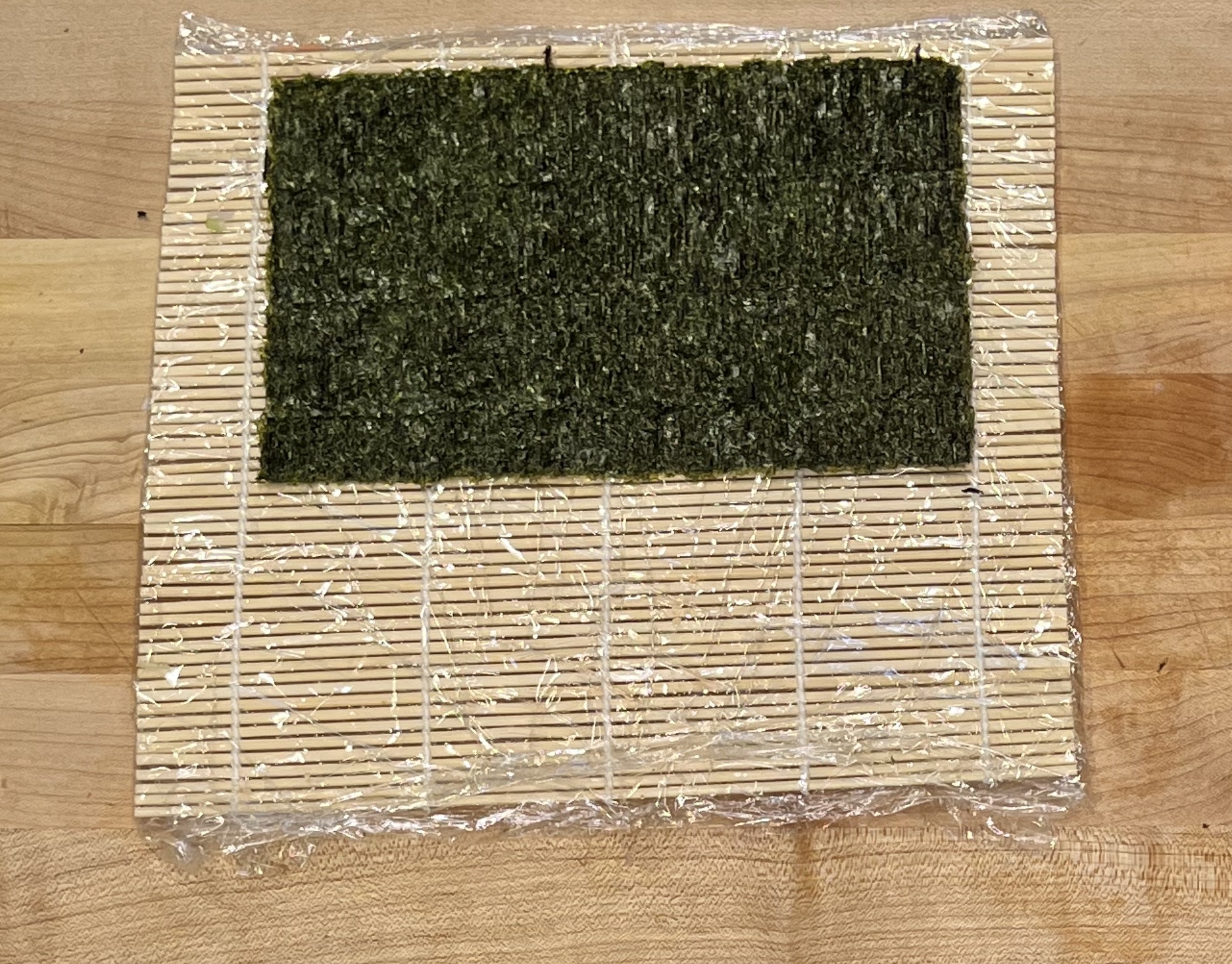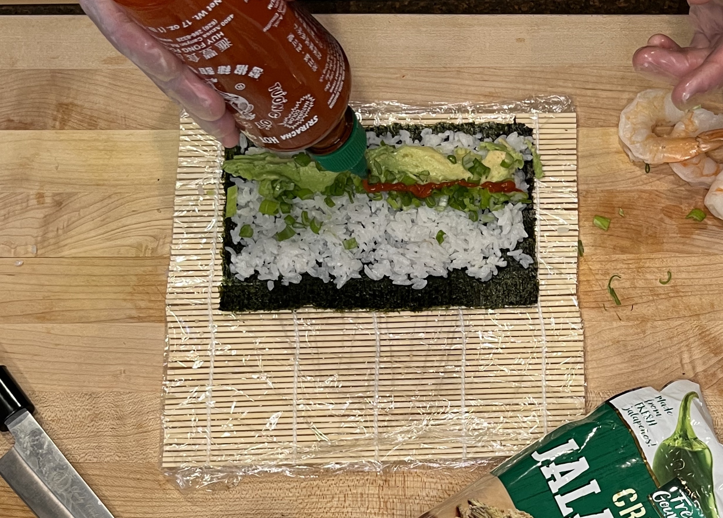 Straighten out the shrimp and place on the nori. We recommend using 21-24 count shrimp or larger to get a better flavor.