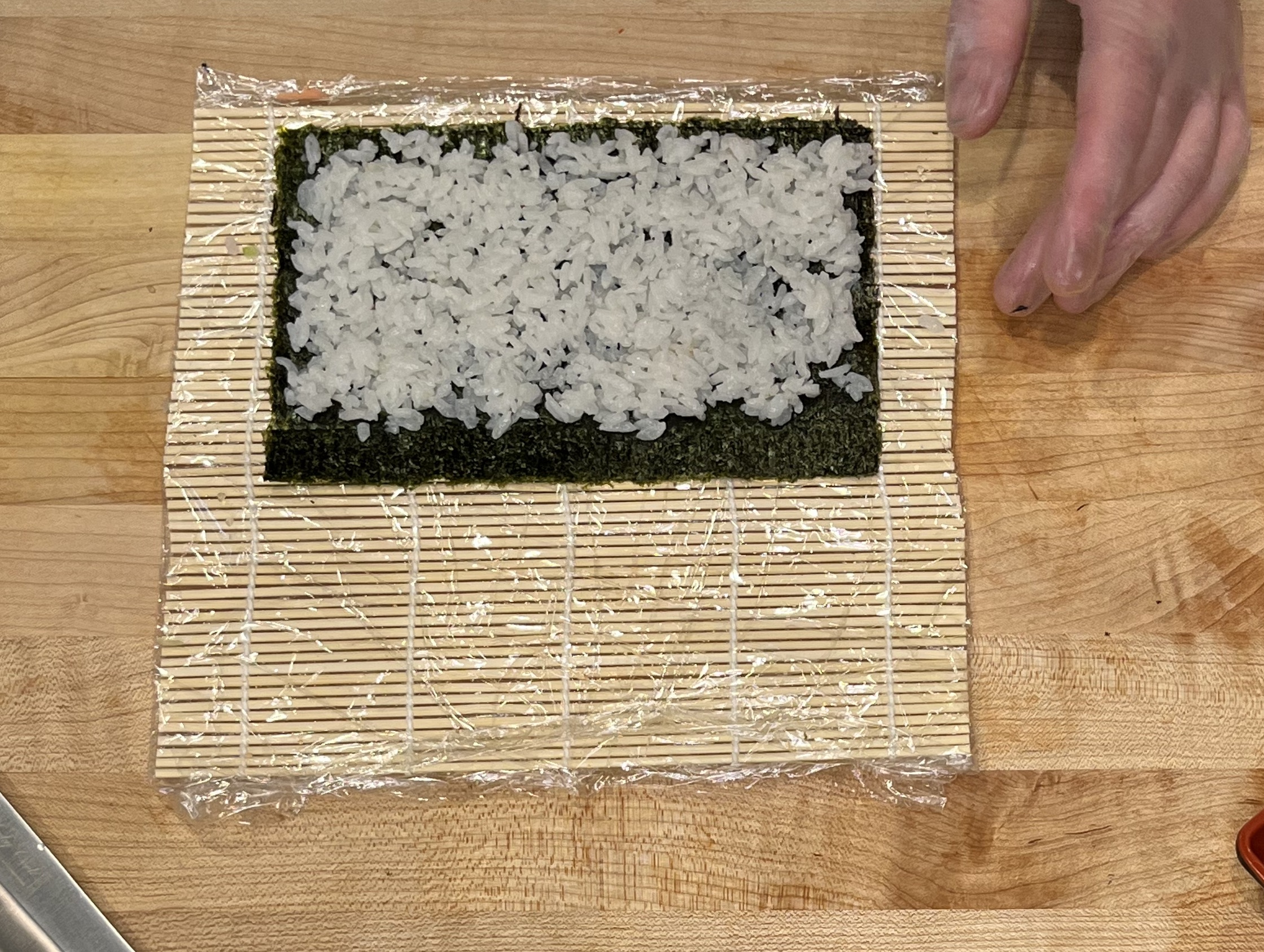 Cover with thin layer of rice. Make sure to leave the end with no rice so that you can seal the roll.