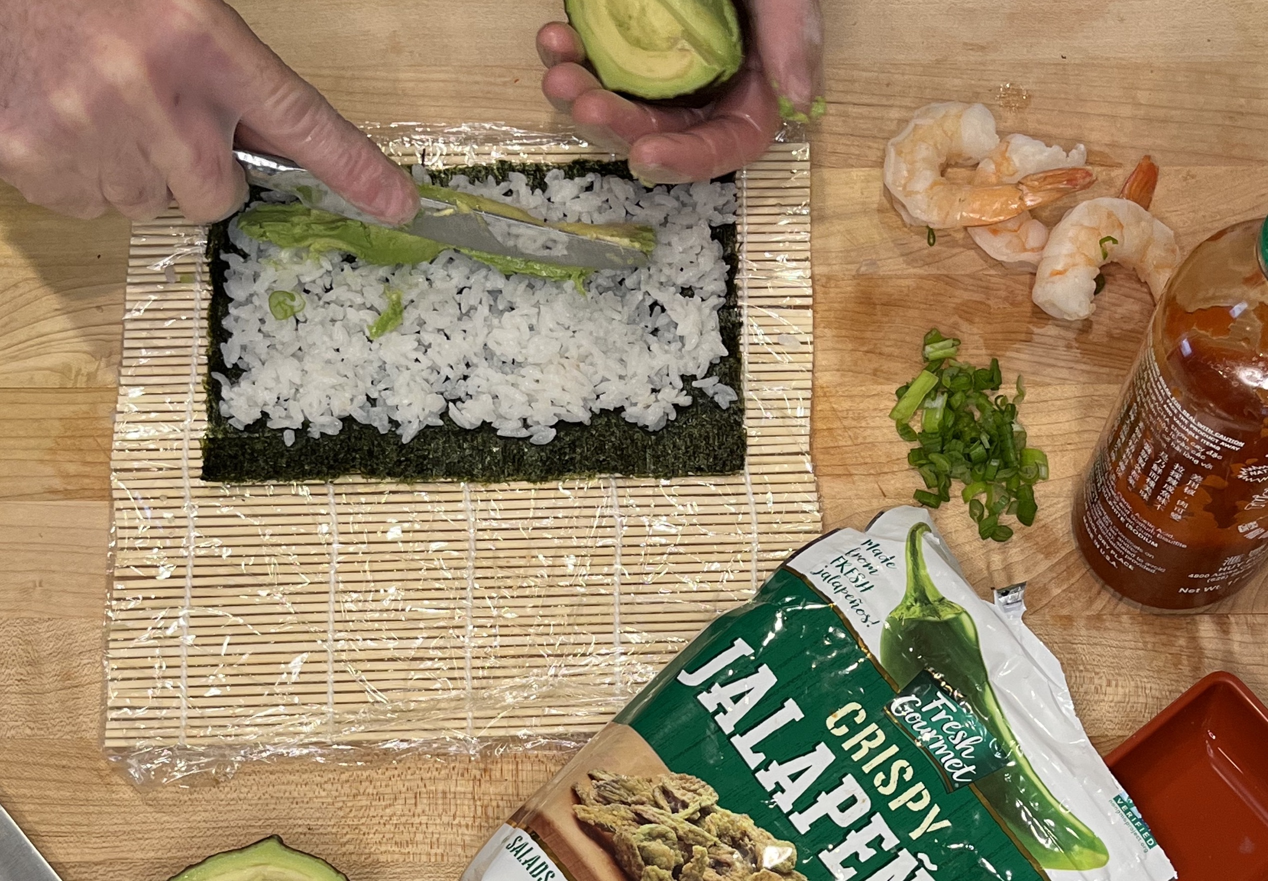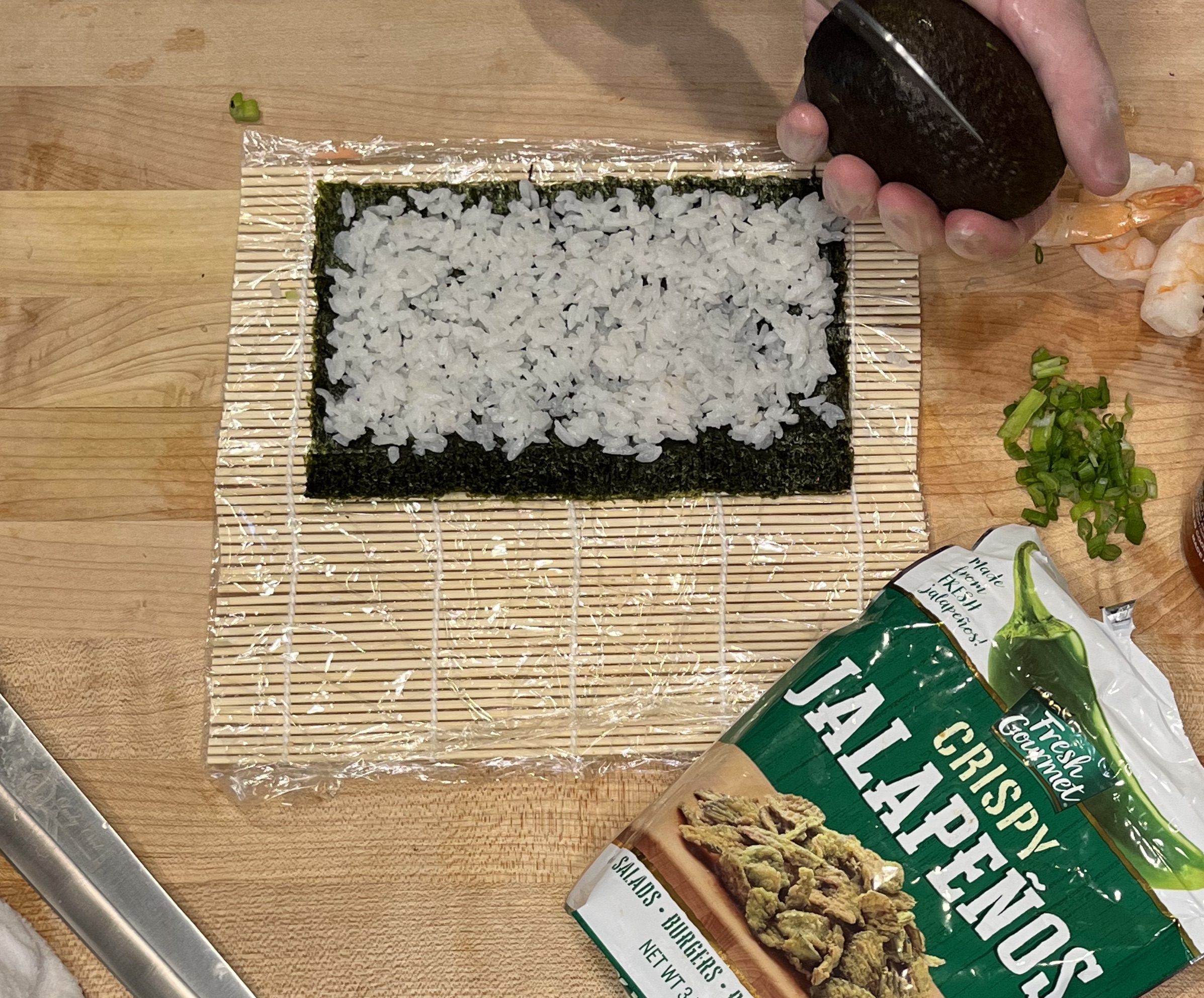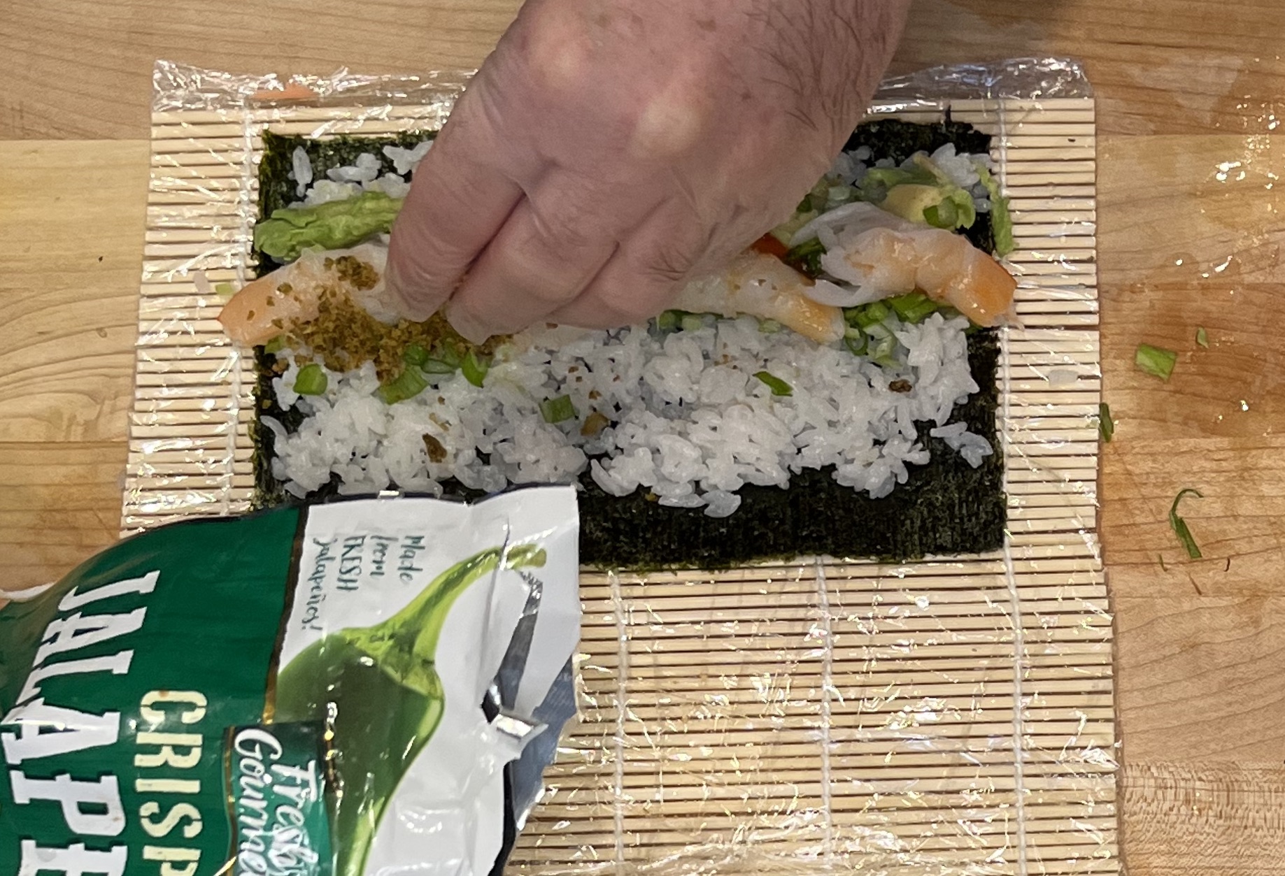 We are going to use crispy jalapenos. You will want to powderize the jalapenos in a blender first or the pieces will deform the roll when you cut it.