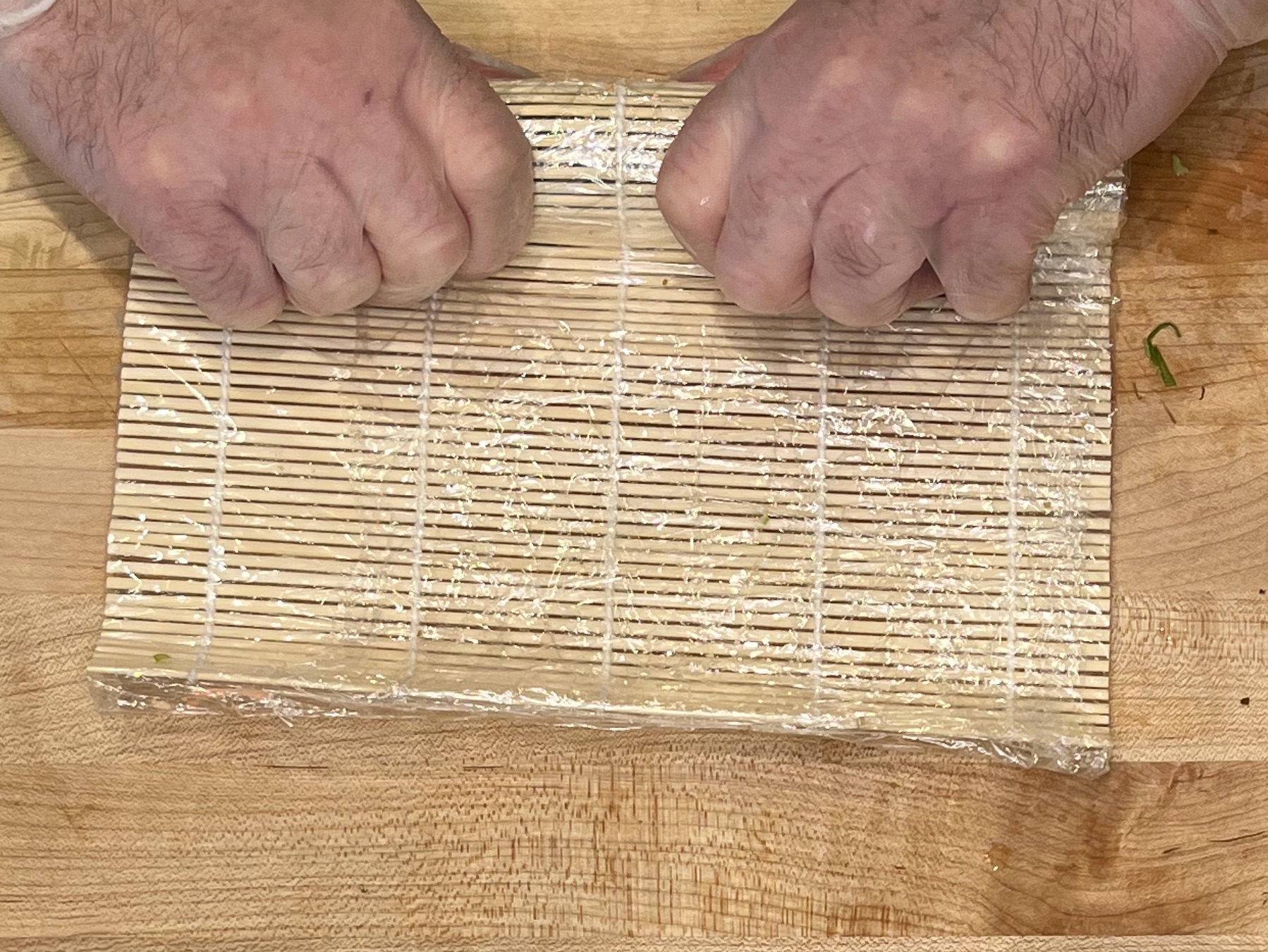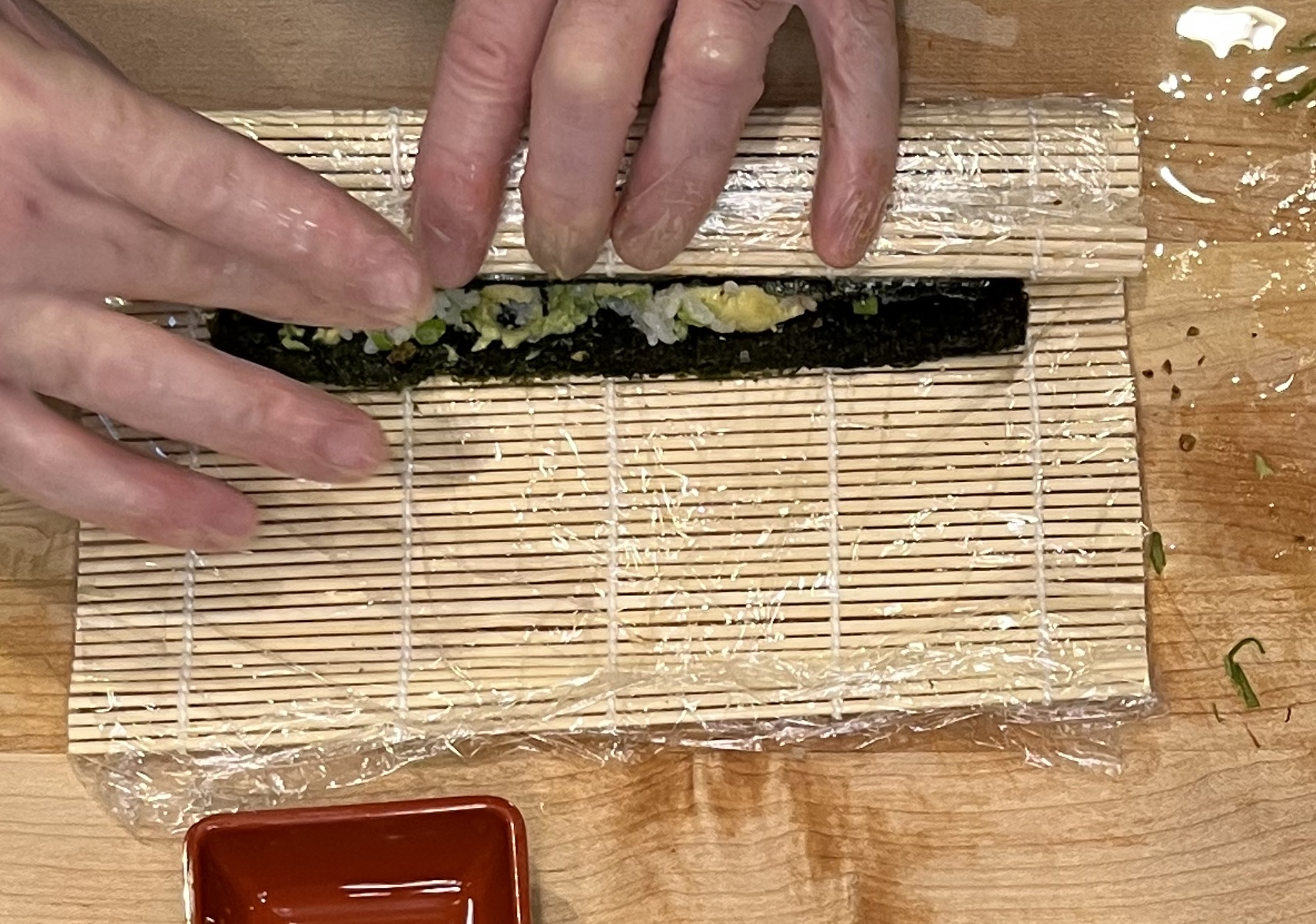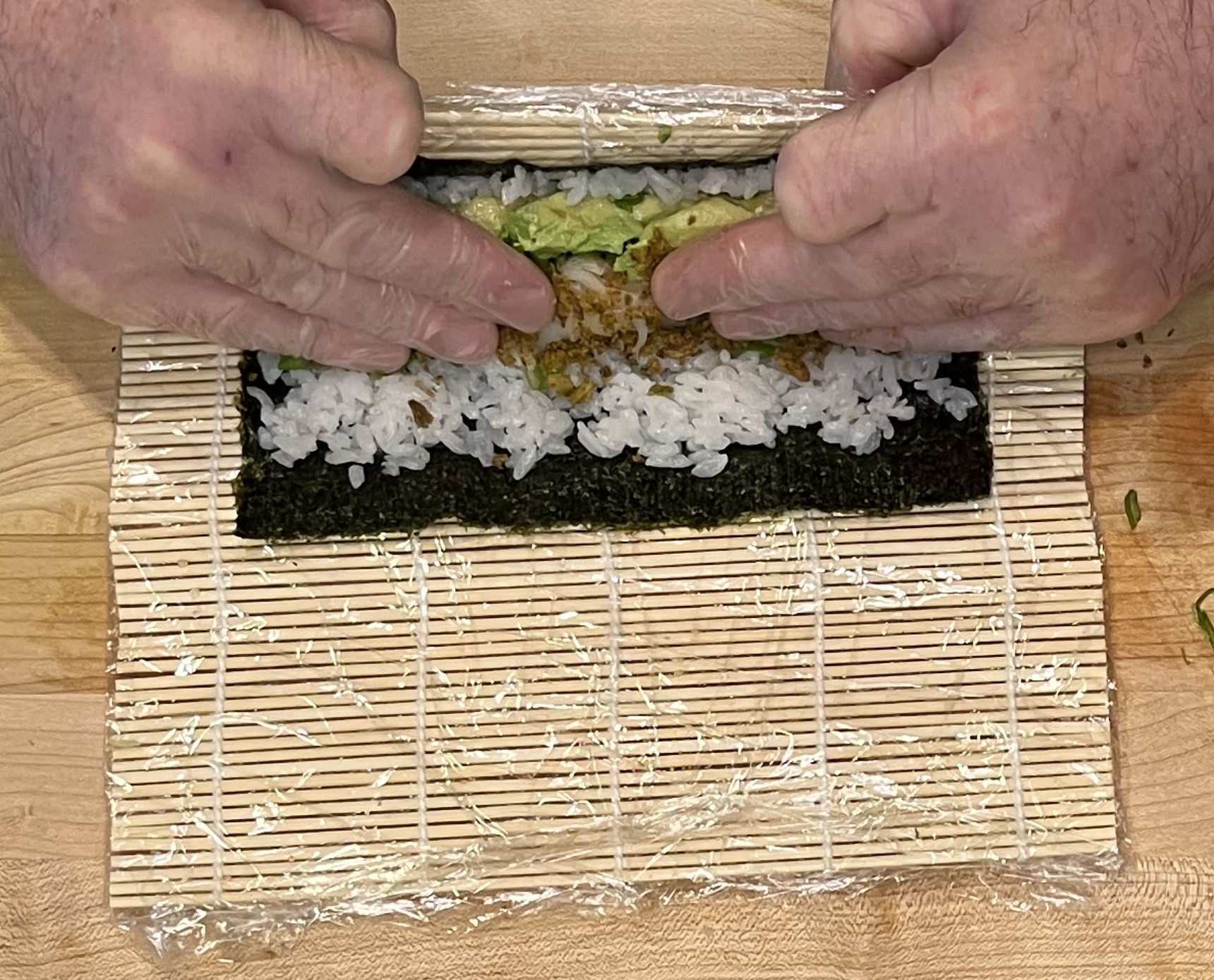 lift the edge of the bamboo while tucking in the ingredients with your fingers.